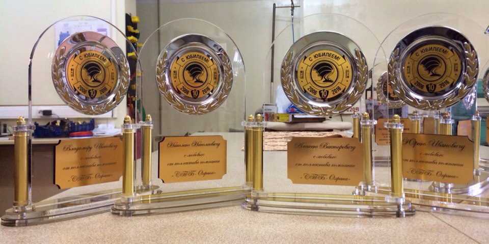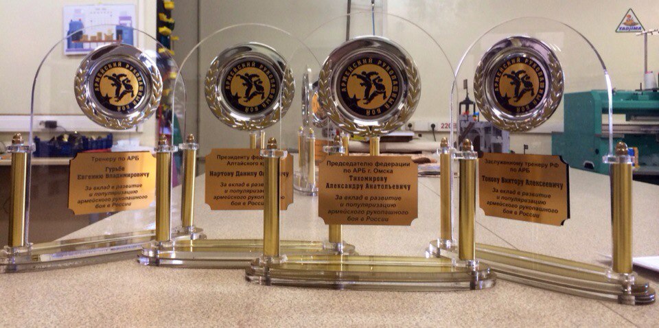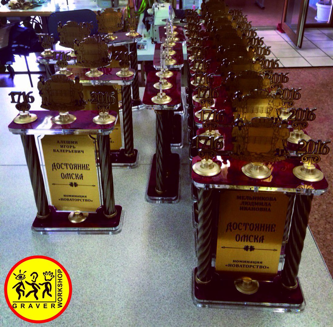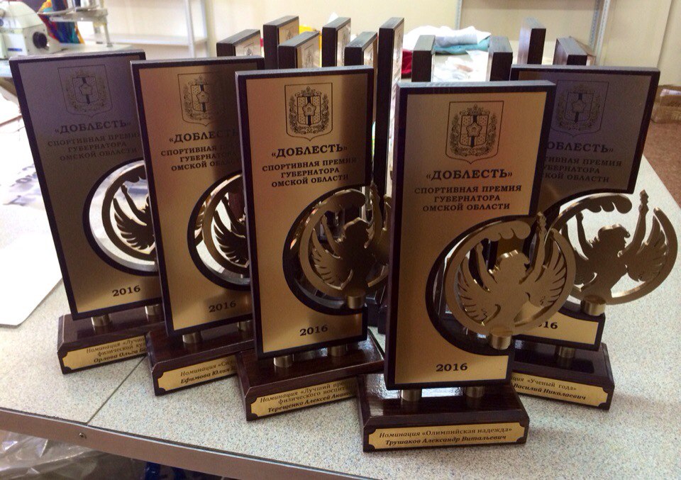 Мы регулярно занимаемся изготовлением наградной атрибутики с использованием таких материалов, как: акрил, дерево, металл, пластик.