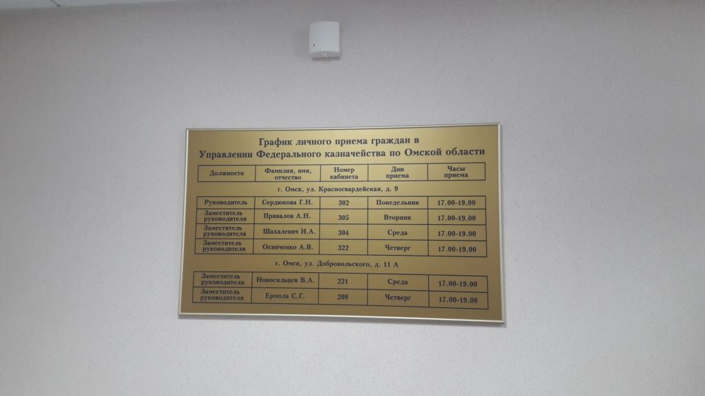 На днях мы одержали победу в торгах для Управления Федерального Казначейства по Омской области, а именно: изготовили и произвели монтаж табличек.