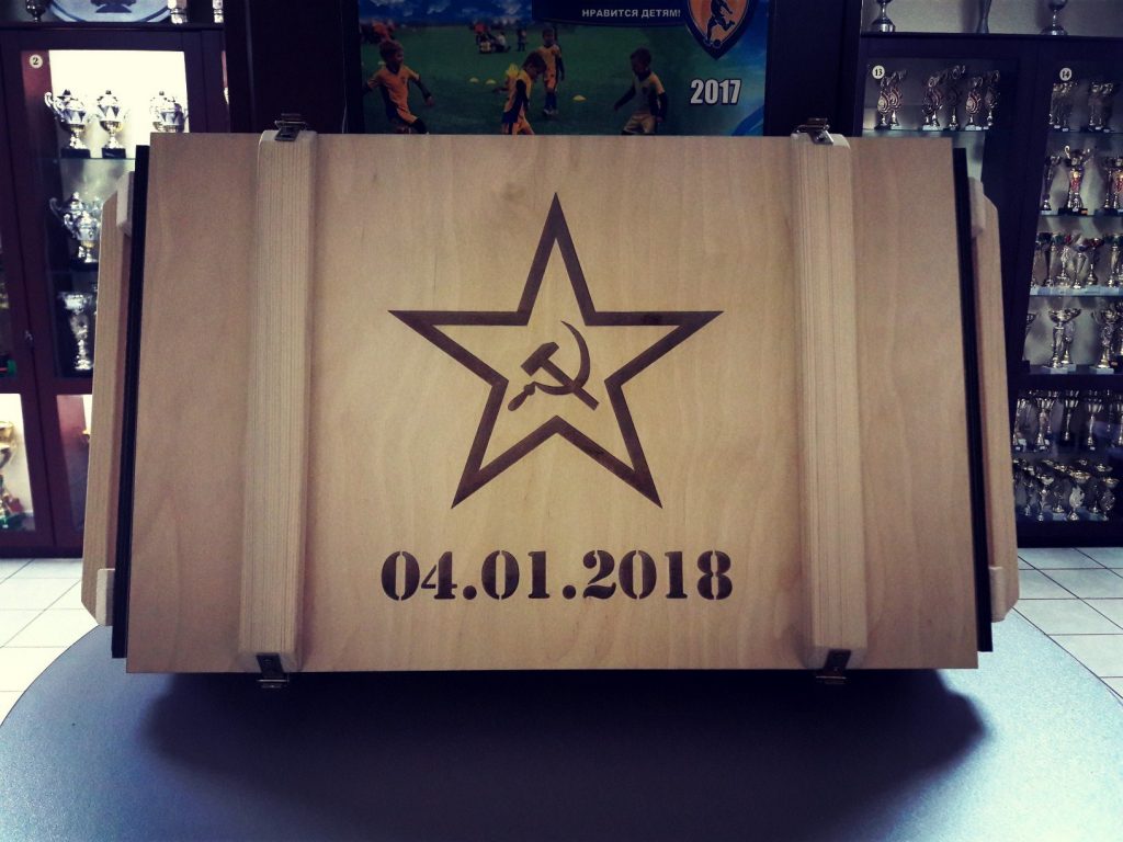 А мы, в свою очередь, изготовили для них ложемент и ящик из фанеры и в завершении ко всему - выполнили на ящике лазерную? гравировку!