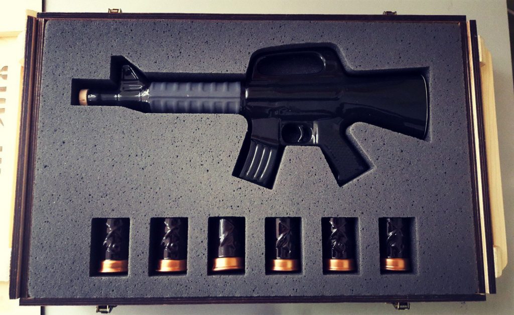 Как Вам такая бутылка в виде автомата, а патроны в виде стаканов?)?