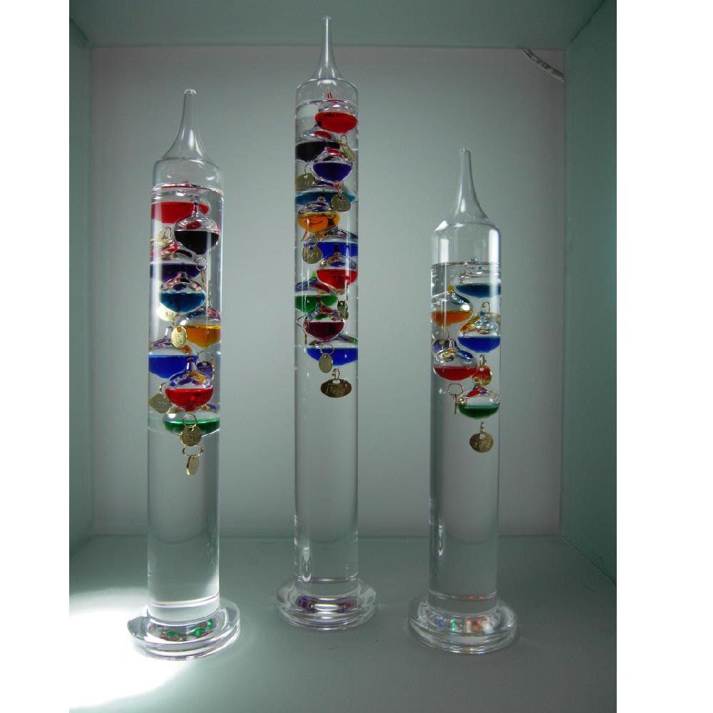 Термометр Галилея — запаянный стеклянный цилиндр, наполненный жидкостью, в которой плавают стеклянные сосудики-буйки. К каждому такому сферическому поплавку прикреплена снизу золотистая или серебристая бирка с выбитым на ней значением температуры.